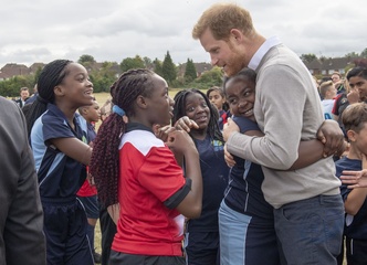 Ksiaze Harry z guzem na czole podczas wizyty Rugby Football Union (RFU) All Schools programme