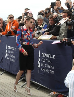 Kristen Stewart w kolorowej koszuli i w rozowej grzywce na festiwalu w Deauville