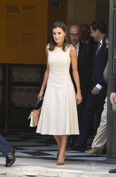 Krolowa Letizia w sukience ecru i krol Filip na wystawie The Longest Journey