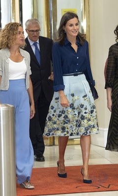 Krolowa Letizia w kwiecistej spodniczce i granatowej koszuli