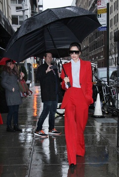 Victoria Beckham w czerwonym garniturze i z ogromnym parasolem
