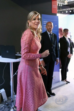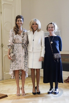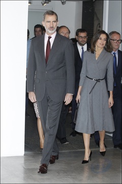 Krolowa Letizia w szarej, kopertowej sukience na wystawie (Poetics of Democracy. Images of the Transition)