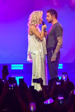 Rita Ora w czarnej, skorzanej mini i w blond lokach