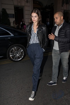 Kaia Gerber w koszuli w paski i w skorzanej kurtce
