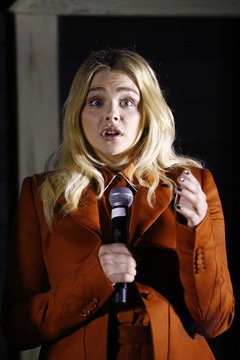 Chloe Grace Moretz w bialej koszuli z zabotem i czerwonej spodnicy