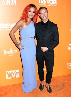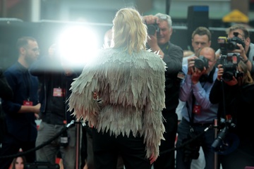 Rita Ora w zoltej sukience Tom Ford i w rozowych piorkach we wlosach