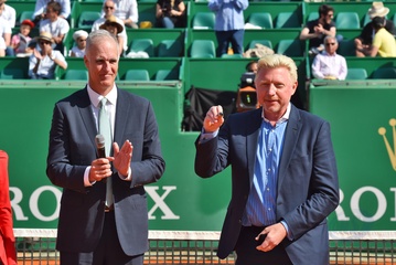 Boris Becker z plastrem na nosie chwali sie pierscieniem Hall of Fame