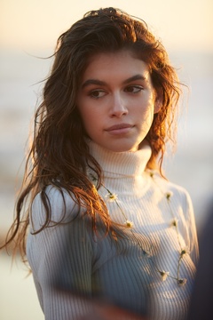 Kaia Gerber, smutna, w szarej marynarce