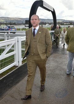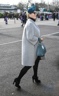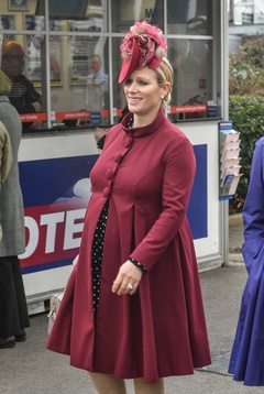 Zara Tindall w szarym plaszczyku na Cheltenham Racecourse