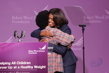 Michelle Obama przemawia do studentow w Edward A. Reynolds West Side High School, Nowy Jork