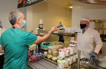Krol Belgii w fartuchu, przylbicy i w maseczce