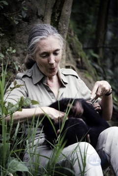 Jane Goodall playing with young chimpanz..........