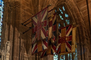 Military memorial to HMS Chester from the Battle of Jutland in World War one. Chester cathedral at Christmas time. Chester, Cheshire, North west England.