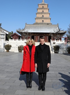 Brigitte Macron w czerwonym plaszczyku i Emmanuel Macron podczas wizyty w Chinach