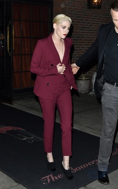 Kristen Stewart w bordowym garniturze, bez bluzki