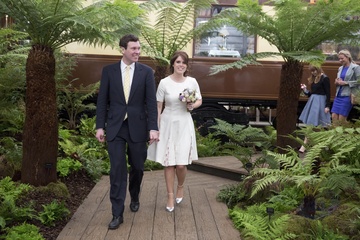 Ksiaze Andrzej z corkami Beatrice i Eugenie podczas Chelsea Flower Show