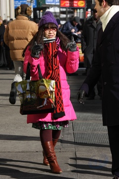 America Ferrera idzie z duza malowana torba, Nowy Jork