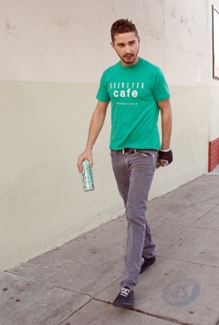 Shia LaBeouf w zielonej koszulce wychodzi ze sklepu, Los Angeles