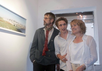 Samuel Irons z matka Sinead Cusack, ojcem Jeremym i dziewczyna Kasia na otwarciu wystawy swoich zdjec z Izraela i Palestyny w The Monster Truck Gallery, Dublin, Irlandia