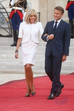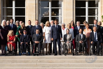Prezydent Emmanuel Macron i jego żona Brigitte Macron witają głowy państw, rządów i organizacji międzynarodowych przed ceremonią otwarcia Igrzysk Paraolimpijskich Paryż 2024 w Pałacu Elizejskim.