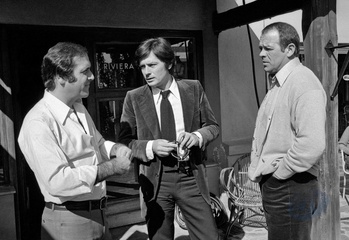 Alain Delon na planie filmu „Comme un Boomerang” w reżyserii José Giovanniego w Nicei w Studios de la Victorine z plenerami w dzielnicy Moulins, marzec 1976”