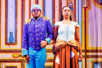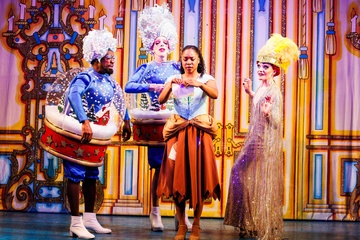 Siobhan James as Cinderella, Nicholas McLean as Buttons, Alexandra Waite-Roberts as Oblivia, the Wicked Stepmother and George Heyworth and Kat B as the Ugly Sisters Nausea and Flatula in the Cinderella Panto at the Hackney Empire in London on 2 December 2