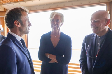 Le président de la République française, Emmanuel Macron lors d'un déjeuner avec les personnalités impliqués dans le cadre de l'Union Internationale pour la Conservation de la Nature (UICN) au restaurant Peron sur la Corniche Kennedy à Marseille