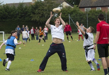 Ksiaze Harry gra z dziecmi w pilke nozna i rugby