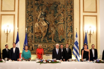 Alexis Tsipras, lVlassia Pavlopoulou-Peltsemi, Brigitte Macron, Prokopis Pavlopoulos, Emmanuel Macron, Betty Batziana