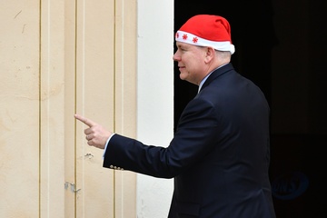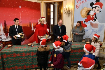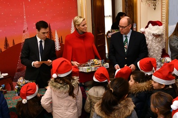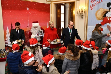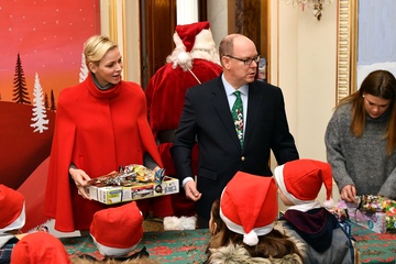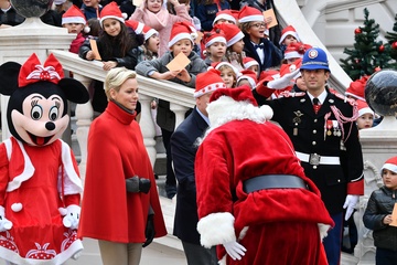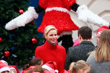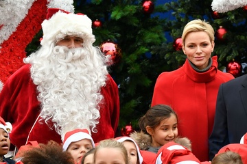 Ksiaze Albert w czapce Mikolaja i ksiezna Charlene w czerwonym plaszczyku