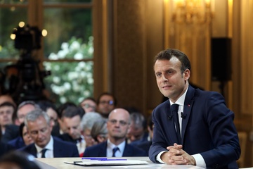 Emmanuel Macron podczas konferencji w Palacu Elizejskim