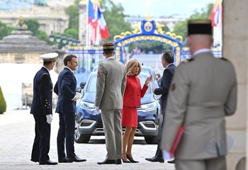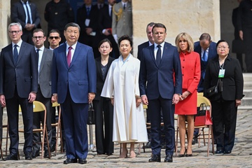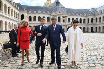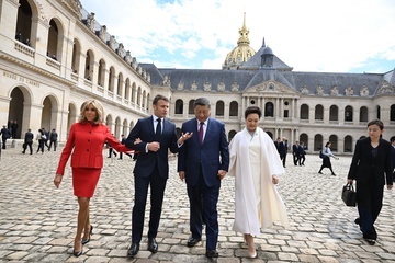 Prezydent Emmanuel Macron, Pierwsza Dama Brigitte Macron, Prezydent Xi Jinping i Pierwsza Dama Peng Liyuan podczas oficjalnej ceremonii powitania w Hôtel National des Invalides w Paryżu 82