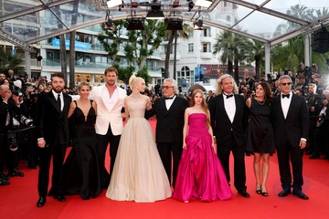 J - Montée des marches du film « Furiosa : A Mad Max Saga » lors du 77ème Festival International du Film de Cannes (Tom Burke, Elsa Pataky et son mari Chris Hemsworth, Anya Taylor-Joy, George Miller, Alyla Browne, Doug Mitchell, Pamela Abdy, Michael DeLuca)