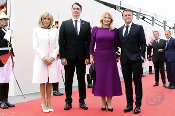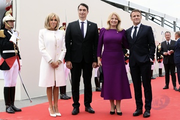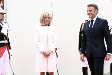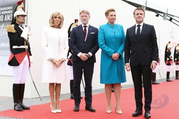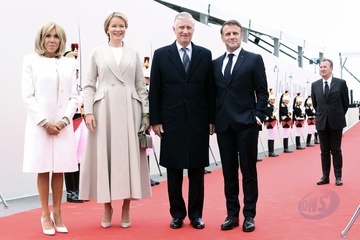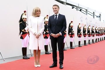 Le président Emmanuel Macron et sa femme Brigitte Macron accueillent les invités de la cérémonie internationale d'Omaha Beach dans le cadre de la commémoration du 80ème anniversaire du débarquement en Normandie (D-Day)