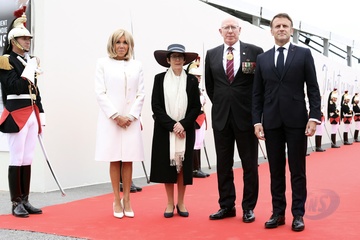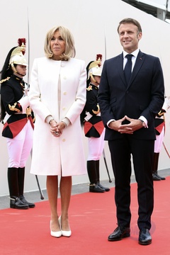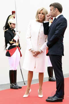 Prezydent Emmanuel Macron Brigitte Macron prez Biden witają gości na międzynarodowej ceremonii na plaży Omaha w ramach obchodów 80. rocznicy lądowania w Normandii (D-Day 65