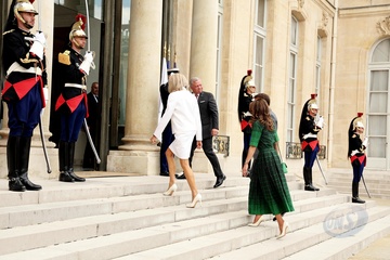 Prezydent Republiki Francuskiej Emmanuel Macron i pierwsza dama Brigitte Macron przyjmują króla Jordanii Abdullaha II i królową Ranię na roboczym obiedzie w Pałacu Elizejskim w Paryżu 53