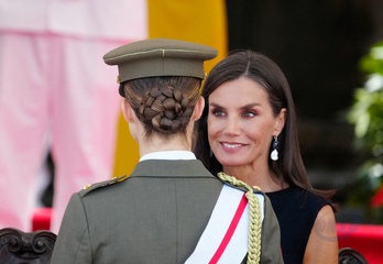 Le roi Felipe VI, la reine Letizia d’Espagne et la princesse Leonor lors de la cérémonie de remise des destitutions royales aux nouveaux officiers de la Marine à Marín