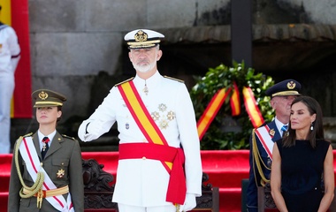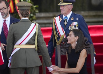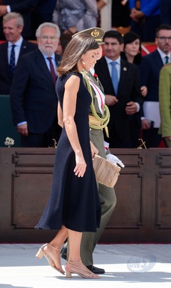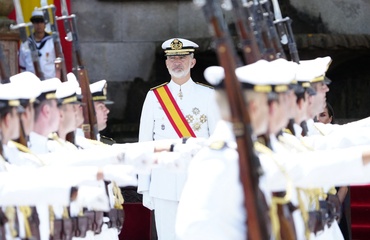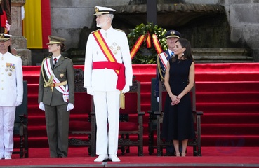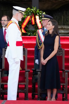 Król Felipe VI, królowa Hiszpanii Letycja i księżniczka Leonor podczas ceremonii przekazania zwolnień królewskich nowym oficerom Marynarki Wojennej w Marín 64