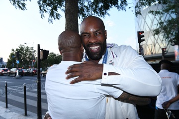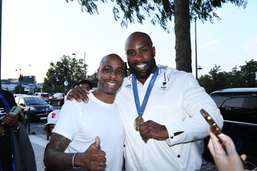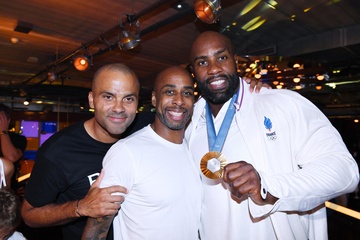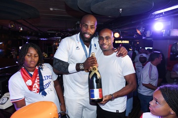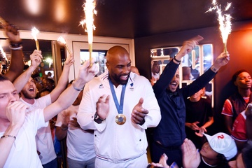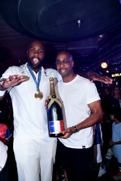 Teddy Riner świętuje swój tytuł mistrza olimpijskiego w judo +100 kg w należącej do grupy restauracji „Podium” (Les bistrots Pas Parisiens) w Paryżu. 75