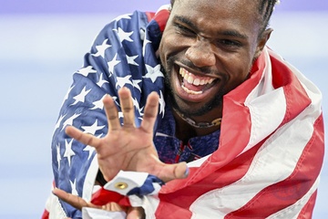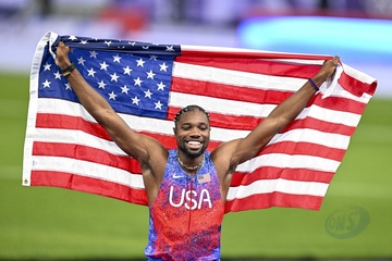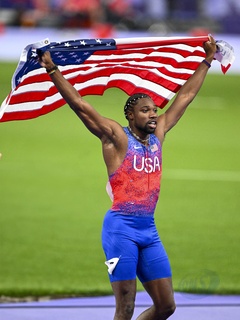 Gwiazdy na finale biegu na 100 m mężczyzn na Stade de France podczas Igrzysk Olimpijskich w Paryżu w 2024 r.