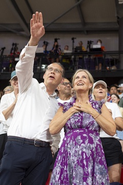 La duchesse Sophie d'Edimbourg assiste à la victoire des britanniques à la finale du sprint par équipes féminin sur piste en cyclisme lors des Jeux Olympiques (JO) de Paris 2024 au Vélodrome National à Saint-Quentin-en-Yvelines