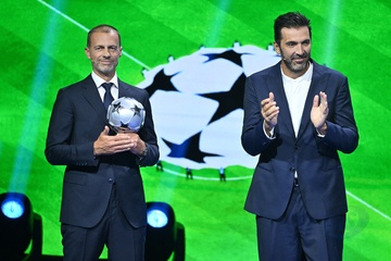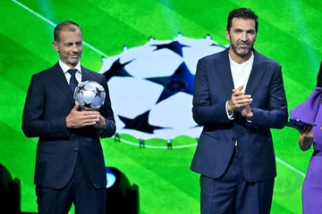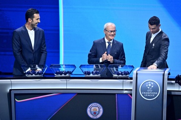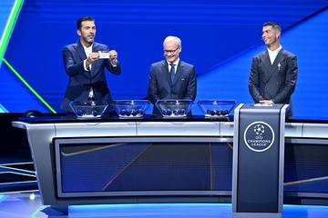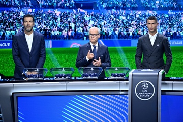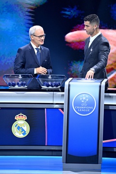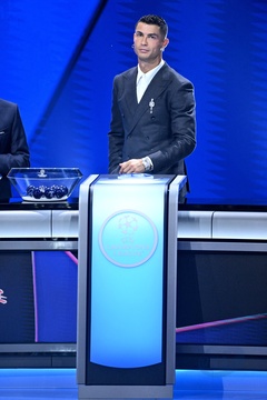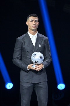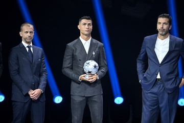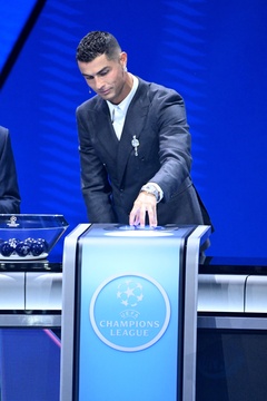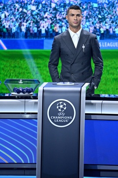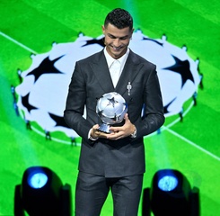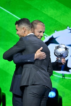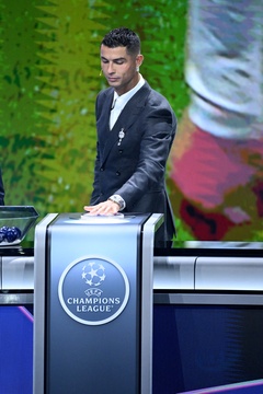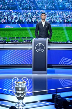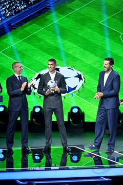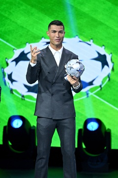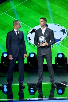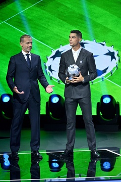 Cristiano Ronaldo reçoit le prix de meilleur buteur de tous les temps lors du tirage au sort UEFA pour la saison 2024/2025 au forum Grimaldi à Monaco