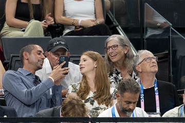 Bill Gates wraz z córką Jennifer Gates i jej mężem, egipskim jeźdźcem Nayelem Nassarem biorą udział w wszechstronnym finale kobiecej gimnastyki artystycznej podczas Igrzysk Olimpijskich w Paryżu w 2024 r.