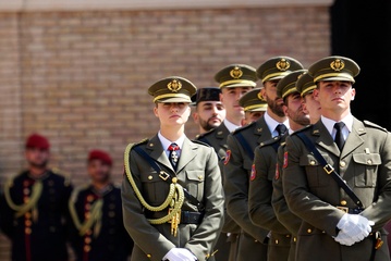 Król Felipe VI i królowa Hiszpanii Letizia oraz księżniczka Leonor podczas ceremonii wręczenia medali dla nowej klasy podoficerów Armii i Gwardii Cywilnej w Saragossie