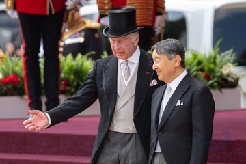 Cesarz Japonii Naruhito stoi obok brytyjskiego króla Karola podczas stanu VI”