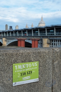 Samaritan's sign on Blackfriar's bridge, placed there succesfully by the photographers wife after a long and hard battle to get approval for such signs, in order to try and reduce the number of suicides from bridges over the River Thames. City of London,