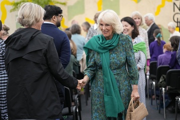 Brytyjska królowa Camilla spotyka się z publicznością podczas niespodziewanego pojawienia się na sesji otwierającej festiwal Charleston w Charleston w Anglii, czwartek, 16 maja 2024 r
