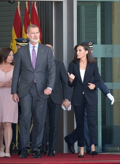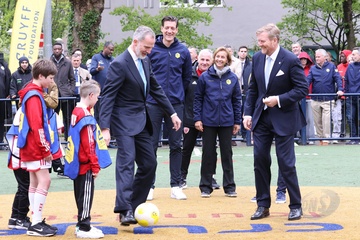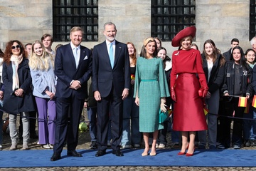 Król Hiszpanii Filip VI i królowa Letycja podczas ceremonii złożenia wieńców pod Pomnikiem Narodowym w Amsterdamie podczas wizyty państwowej hiszpańskiej pary królewskiej w Holandii