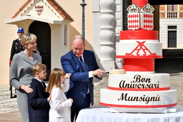Książę Monako Albert II świętuje swoje urodziny (66 lat) z księżniczką Charlene z Monako i ich dziećmi, księciem Monako Jakubem i księżniczką Gabriellą z Monako na Place du Palais Princenier w Monako.