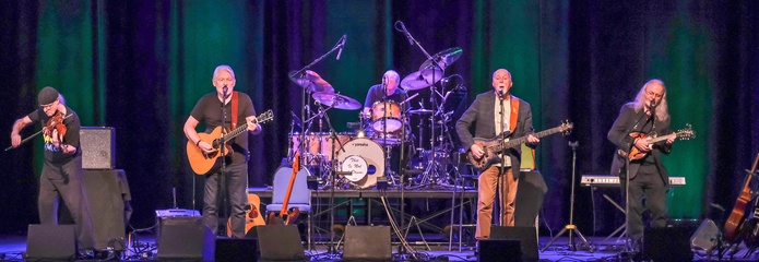 Fairport Convention.Corn Exchange.Exeter UK.25 lutego 2024 r.: Simon Nicol, Dave Pegg, Chris Leslie, Ric Sanders i Dave Mattacks, Fairport Convention podczas Win Tour 2024 występują przed liczną publicznością Corn Exchange Exeter